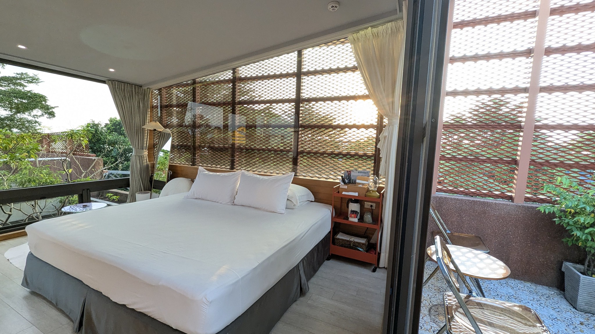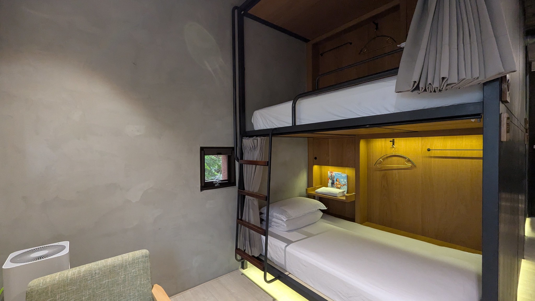 舊磚牆與水泥結構被細心清理,窗框依然維持原本的比例與鐵件肌理。透過玻璃屋頂與金屬格柵的引光設計,陽光在屋內形成斑駁的節奏,讓老建築有了新的呼吸。內部空間則以極簡與柔色木質調為主,房間配置多樣:有適合雙人的明亮套房,也有上下舖的多人房,兼具旅宿與聚落社交空間的氣息。可以包棟,也可以單人或家庭入住。
