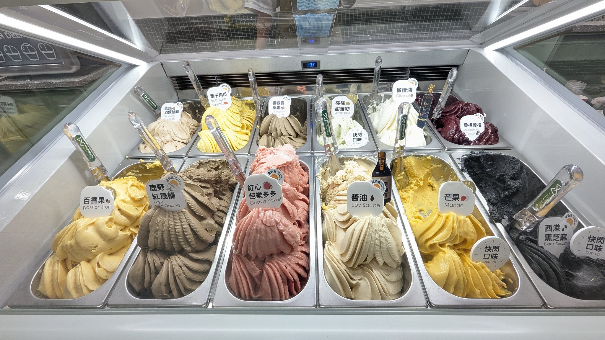 「兩人四口」光是機器設備就斥資上千萬。冰櫃裡的主角之一,是用豆油伯醬油製成的冰淇淋,淡淡的回甘香氣,出乎意料地好吃。而芝麻也來自西港盛產的黑芝麻,讓在地食材化為難以忘懷的風味。