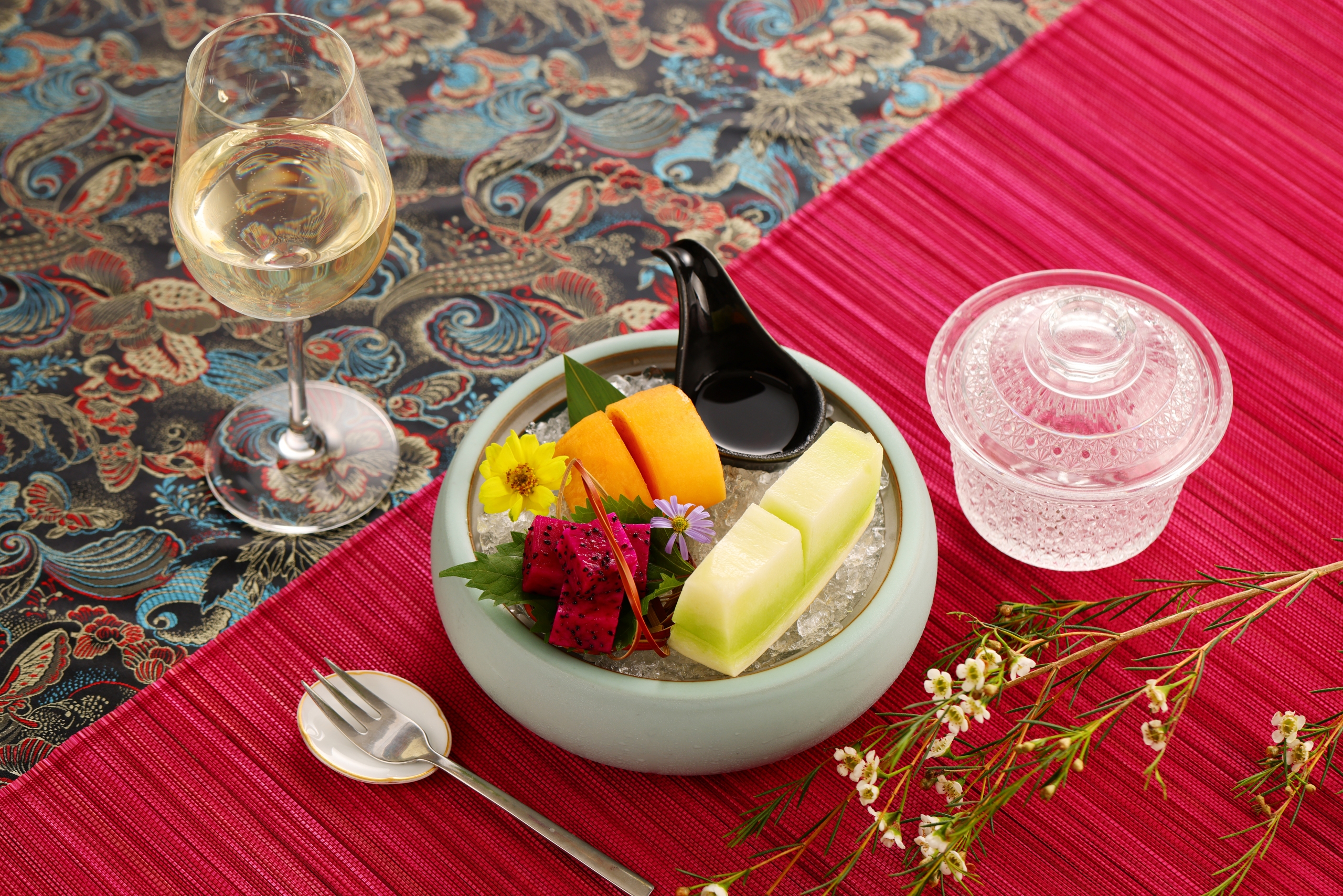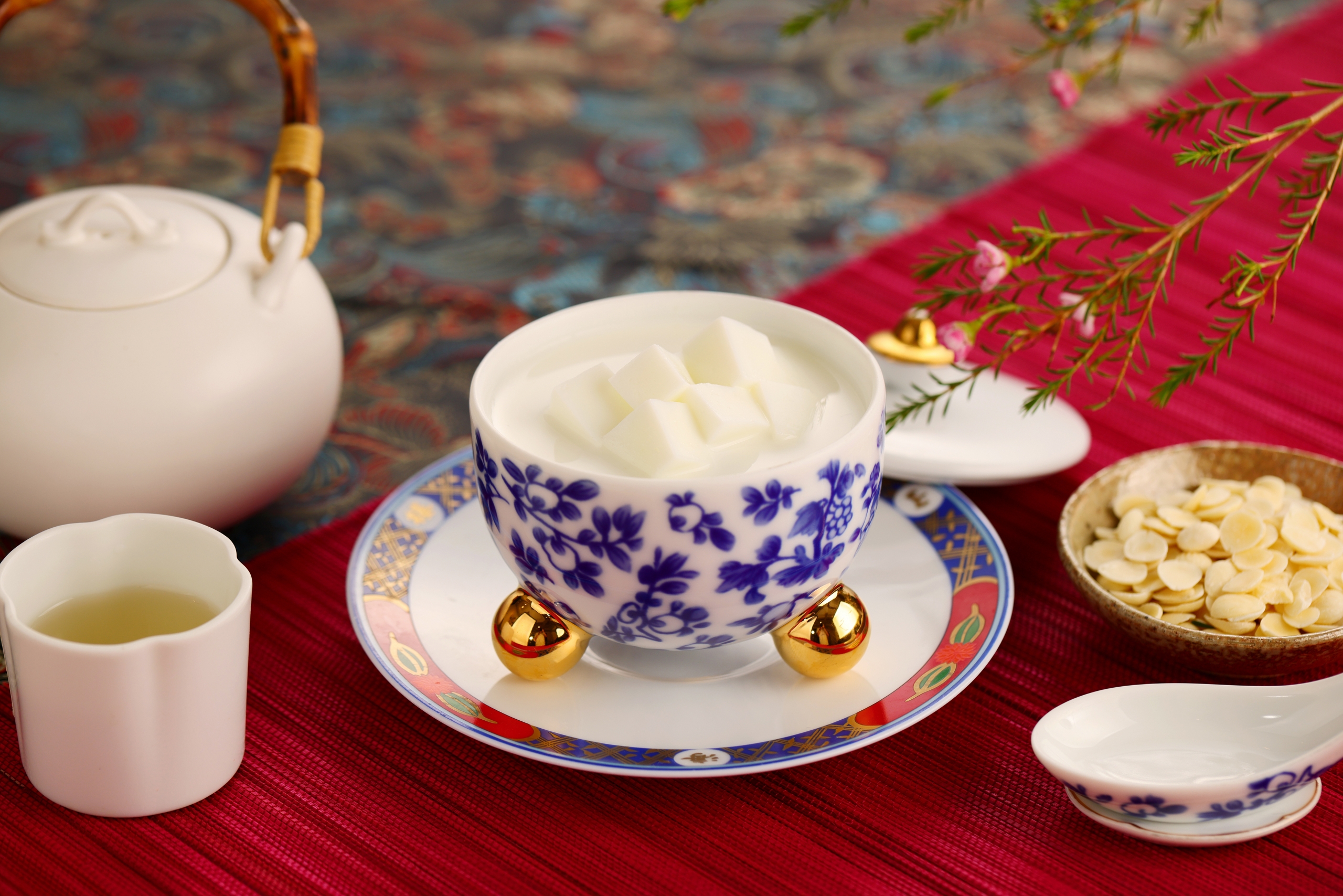 尾聲的【杏仁豆腐】取材自1923年皇太子宴甜品「杏仁茶」,以南杏與花生細磨成漿,手工拌攪四十分鐘以上,綿密彈嫩、香氣圓潤;再以當季水果畫下句點,為百年故事留下一縷清香。