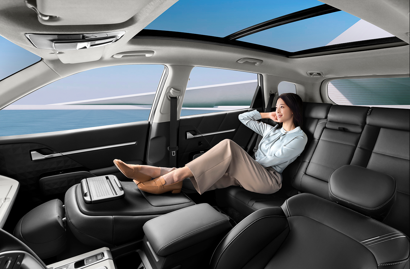 延伸到後排,MUFASA 的設計更體現了居家式的舒適感,後座仿若家中的沙發,具備兩段式椅背調整與寬裕腿部空 間,讓孩子可以自在伸展,它並非單純的乘坐區,而是能轉換為娛樂、休閒甚 至小憩空間的模組化單元。而副駕駛座則可完全向前傾倒,創造「後排懸浮空間」,這種安排呼應了 lounge 家具的語言,當需要休息、伸展,空間便因座椅 的調整而重新定義,將「家具可塑性」 的概念於汽車空間內完美轉化,將汽車化作一處能隨時間與心境而變的居所。