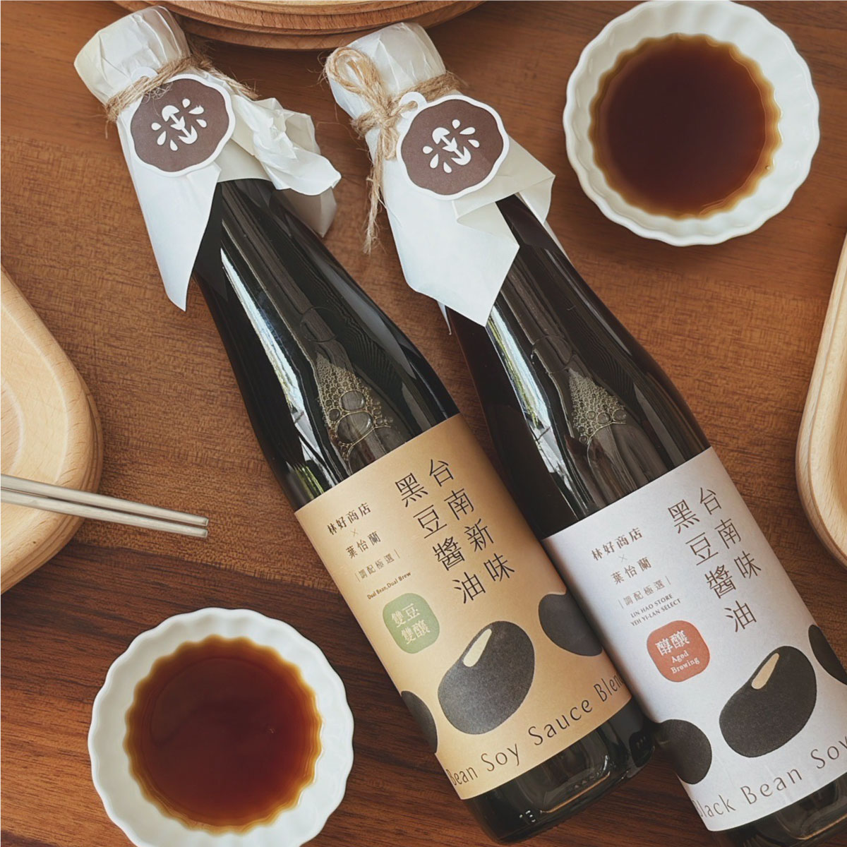 此次聯名的核心概念為「調配哲學」,並推出兩款新品——「四季常日茶」與「雙豆雙釀醬油」。前者透過多款台灣茶的調配,創造出具備深度但不喧嘩的風味結構:青草氣息、焙火溫度與尾韻回甘以細膩節奏相互銜接,使其既能作為日常飲品,也保留了專注品飲時的層次變化。後者則以黑豆與黃豆雙軌釀造,整合台灣南北醬香的差異,使醬油同時具備溫潤厚度與俐落線條;無論用於涼拌、浸滷或作為最後的風味點綴,都能以精準方式強化食材本味。