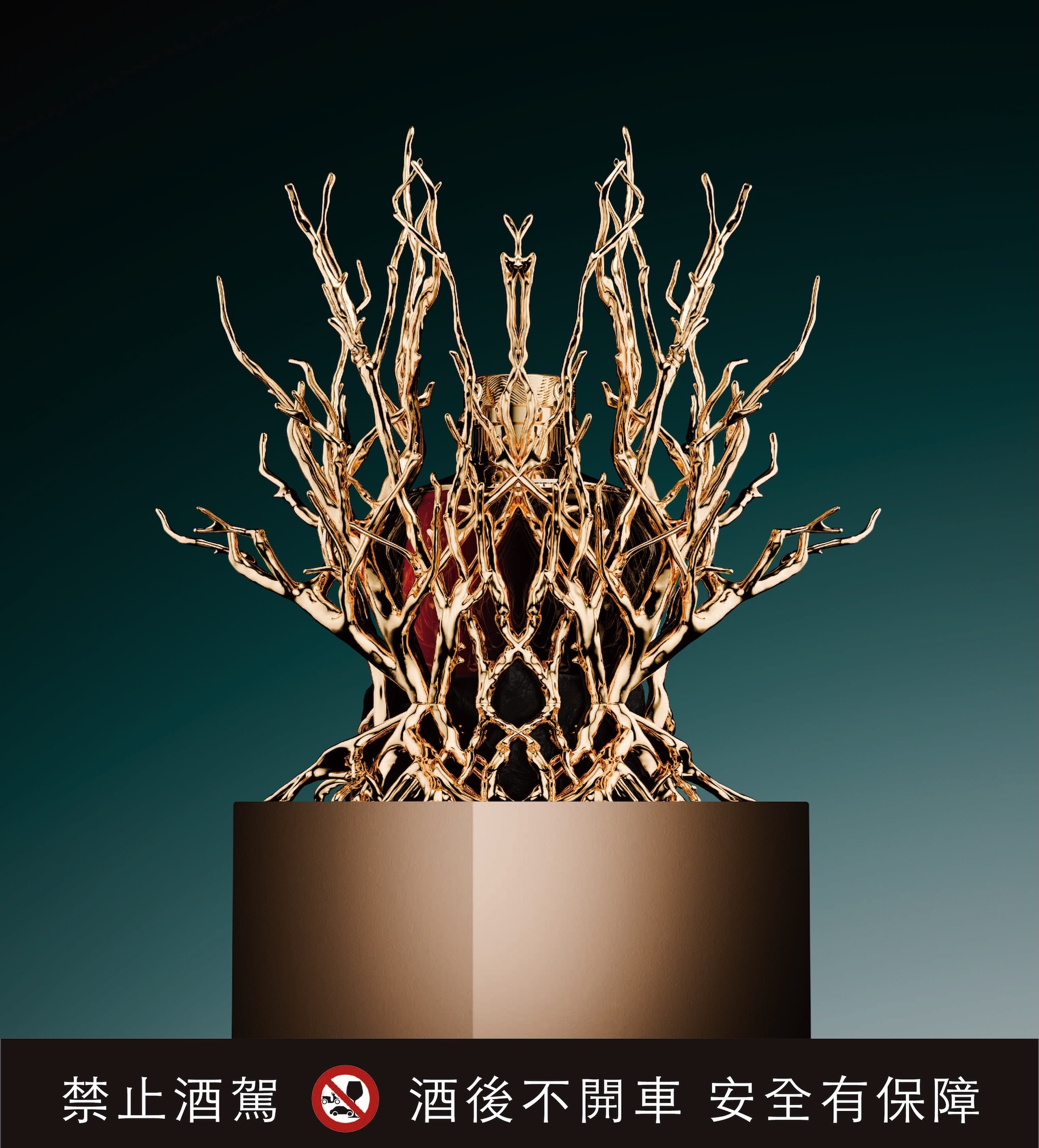 為了完美體現永恆時光的具象,「Fredrikson Stallard」以蘇格蘭「焚荒」傳統啟發,毅然決然踏上格蘭利威酒廠舊址的朝聖之路,在親眼見證貧瘠岩縫中綻放的石楠花中,決定從石楠花的枯枝為靈感,在以純 24K 鍍金與訂製水晶玻璃寶石的酒身上,鋪陳透過 3D 列印鍍銅覆金的金色枝幹,再用標誌性的湖水綠刻面玻璃點綴岩石底座,不僅完美展現出宛若鳳凰盤旋升起神聖姿態,更完整擁抱歷史、記憶與地貌的層層堆疊。從不同角度觀看,材質在光影下形成深淺交錯的韻律,彷彿時間正沿著作品表面緩緩流動,使原本抽象的歲月成為一座能被凝視、觸摸與收藏的當代藝術。