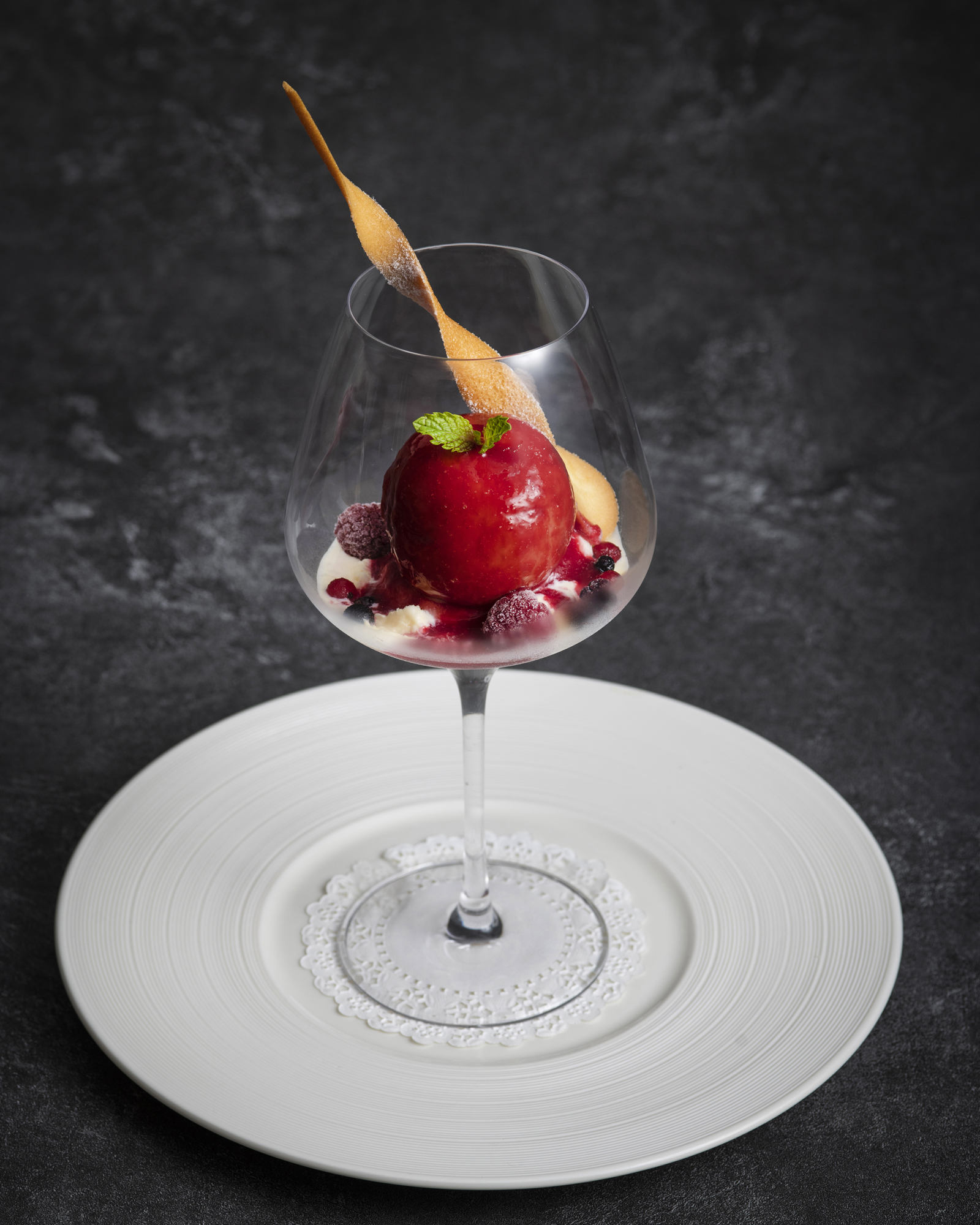 甜點師吳宏祥師傅專心致志於西點烘焙長達28年, 曾任神旺飯店、老爺飯店甜點師,烘焙西點皆精,擅長法式盤式甜點,以各式千層派皮,酥皮塔殼為基底,搭配冰淇淋、奶醬乳霜等等,更打破鹹甜點新的窠臼,如松露冰淇淋、羅勒冰沙、月桂葉、番紅花等,運用香料讓甜點千變萬化,也善用水果創造酸甜風味,外觀上以簡約大器的形象呈現給貴賓。同時也擅長經典法式甜點,如羅曼諾夫Strawberries Romanoff、法國蜜桃Peach Melba等,以全手工製作的精緻法式為海峽會各餐期華麗收尾。