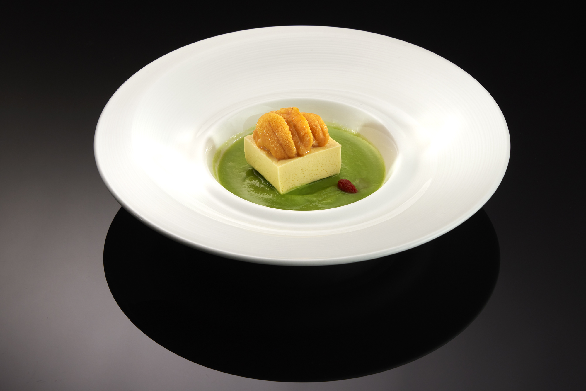 門間料理長擅長以擅長正統會席料理,逢母親節的初夏套餐想呈現的是清新颯爽的原初滋味,採用日本空運漁獲,以健康無負擔為取向,展現天然食材的風味!〈喜知次與綠蘆筍〉喜知次魚有「海中紅寶石」的美譽,肉質細緻,膠原蛋白豐富;〈玉子豆腐 豌豆醬汁與海膽〉皆以食材的原初滋味呈現,三種口感綿密滑順的食材交融,風味迷人、層次豐美。