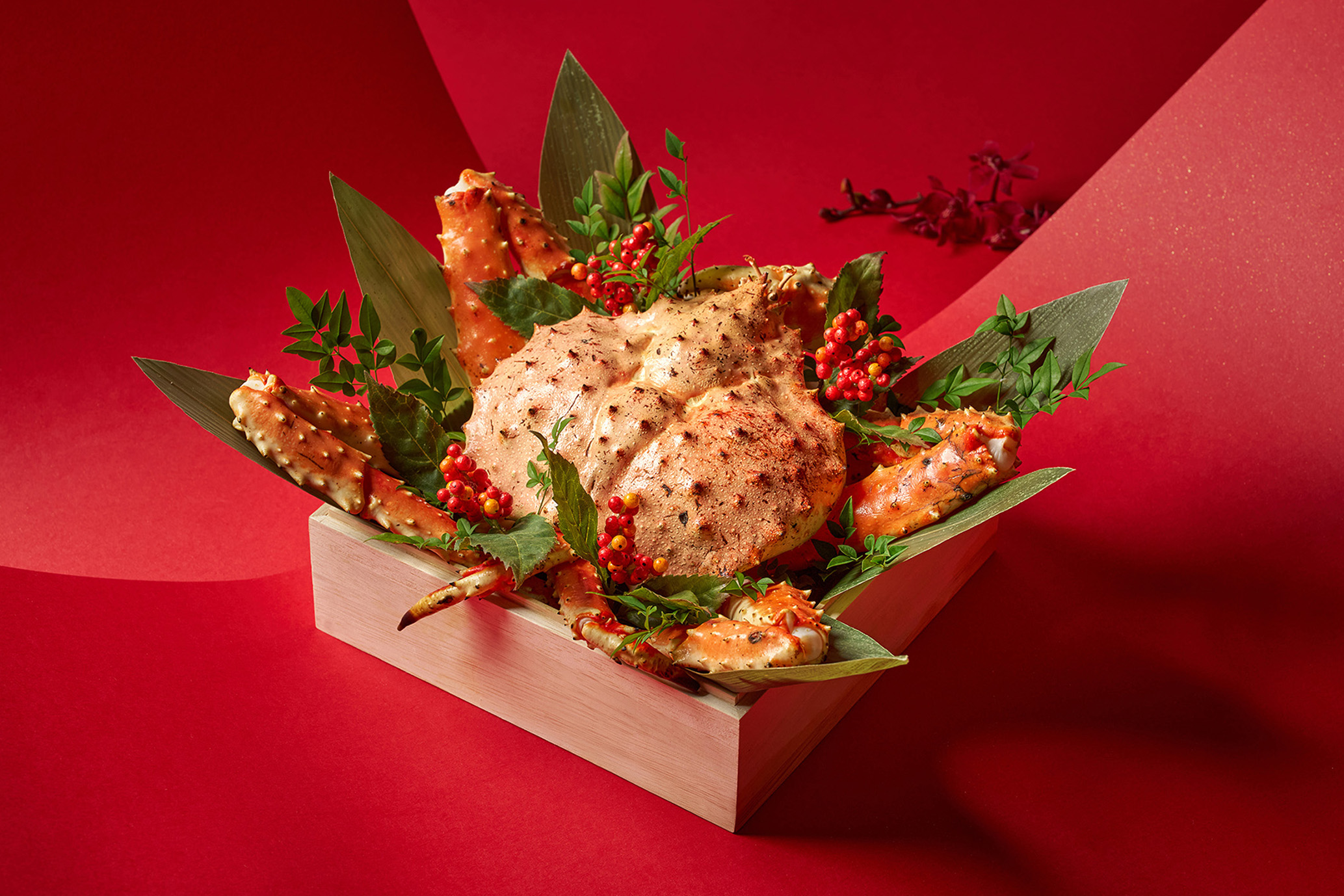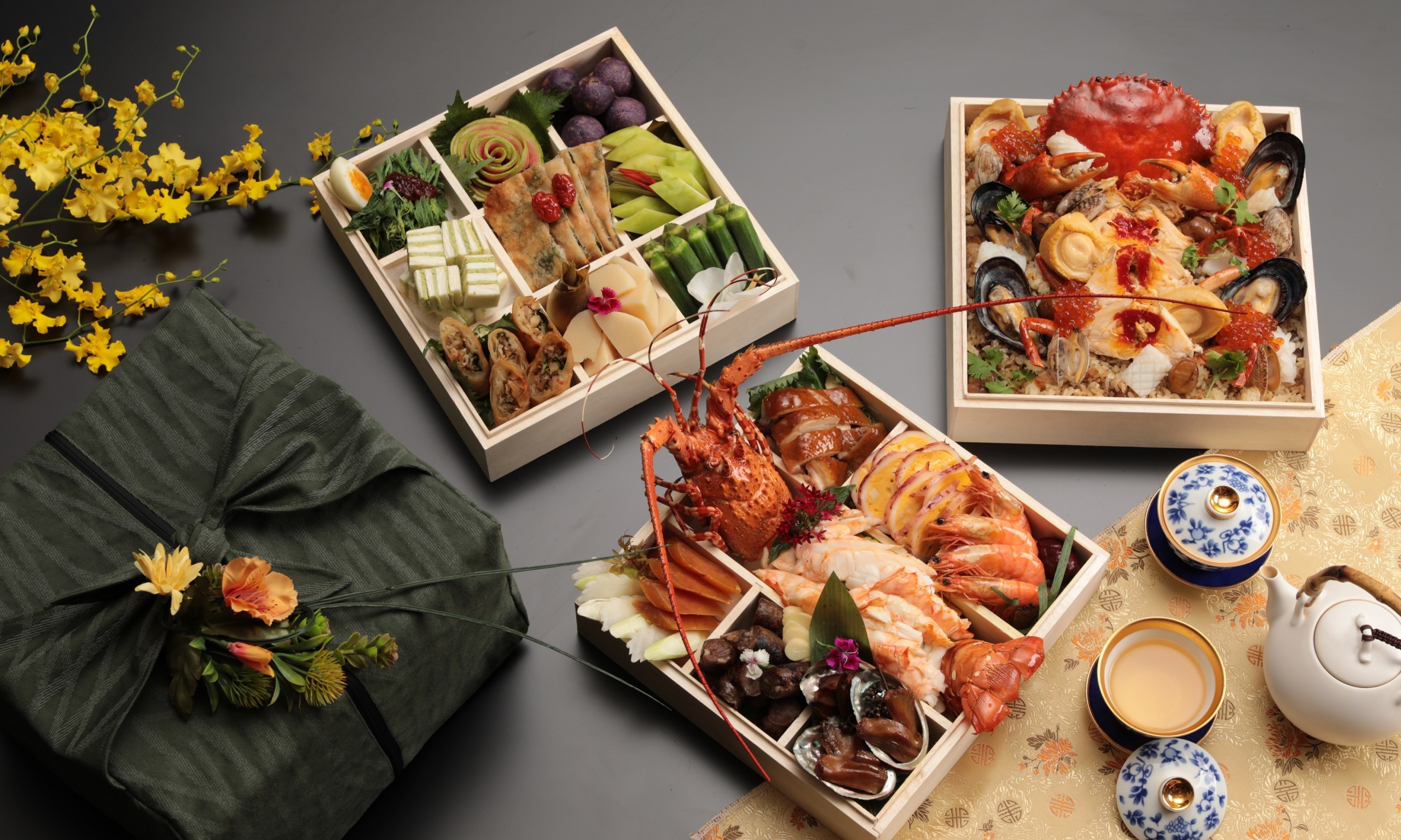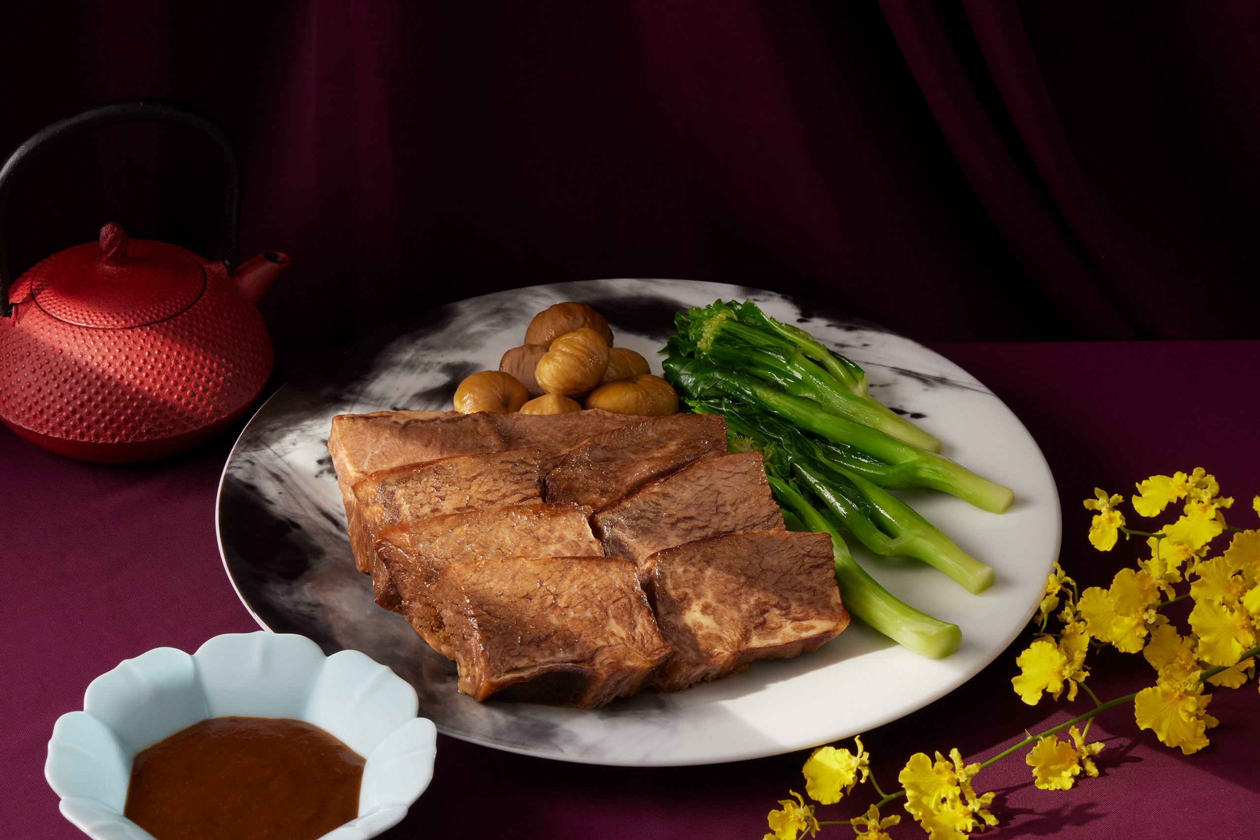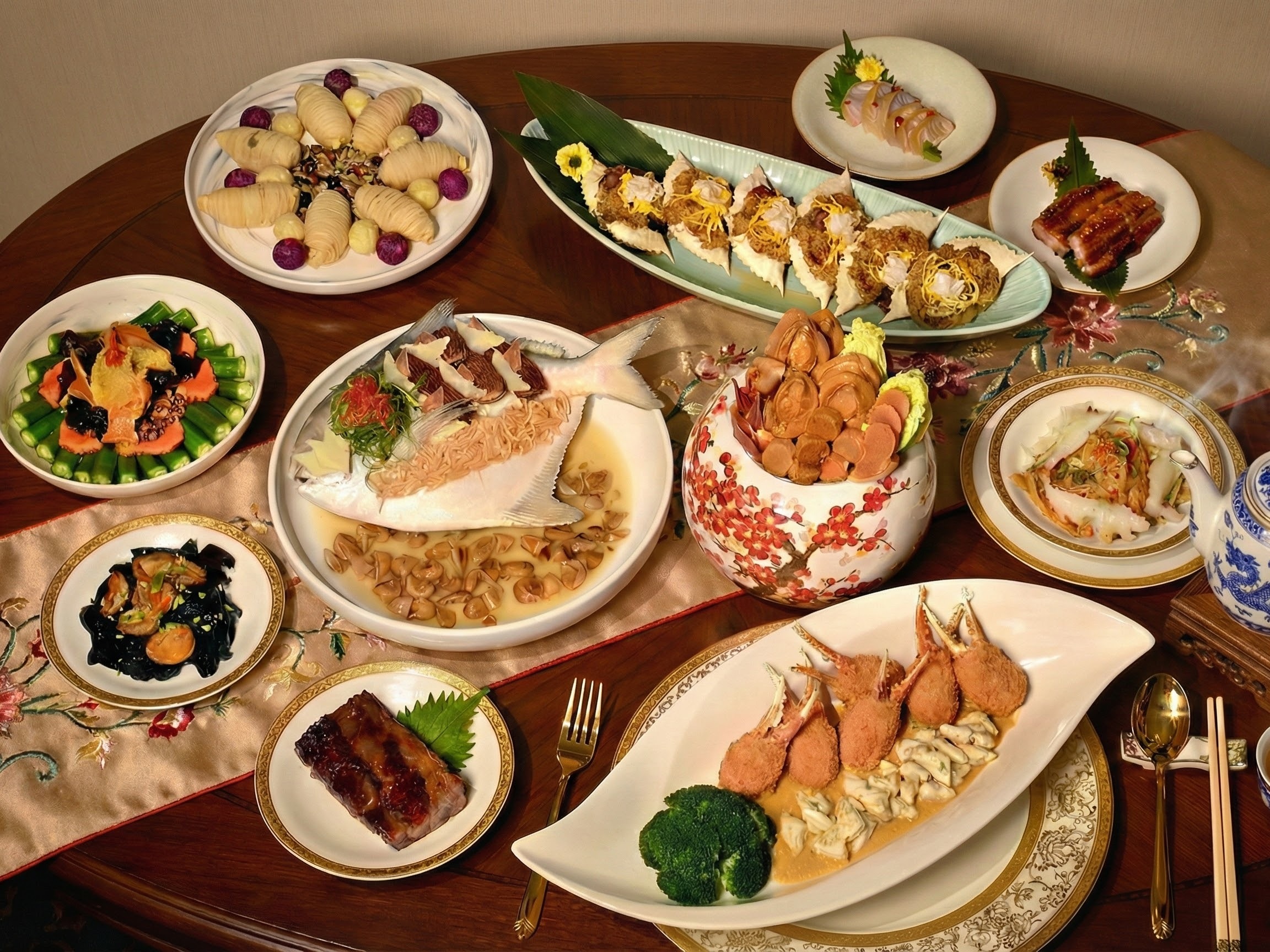 晶華的年菜更像一座可自由組裝的宴席資料庫。七大餐廳同步出手,讓圍爐餐桌可以依家庭結構自行編排。晶華軒的古法佛跳牆是核心主菜,乾貨比例拿捏得宜,湯體厚實卻不顯負擔;搭配粵式花膠與鮑魚料理,可組成完整的粵菜年宴。宴會廳的總鋪師白鯧圍爐宴,延續台式辦桌節奏,白鯧、龍蝦、芋泥依序上桌,長輩接受度高。三燔的鱈場蟹與龍蝦鍋物,則讓年夜飯轉為共享型餐桌;ROBIN’S 的肋眼或威靈頓牛排,提供完全不同的年菜結構。