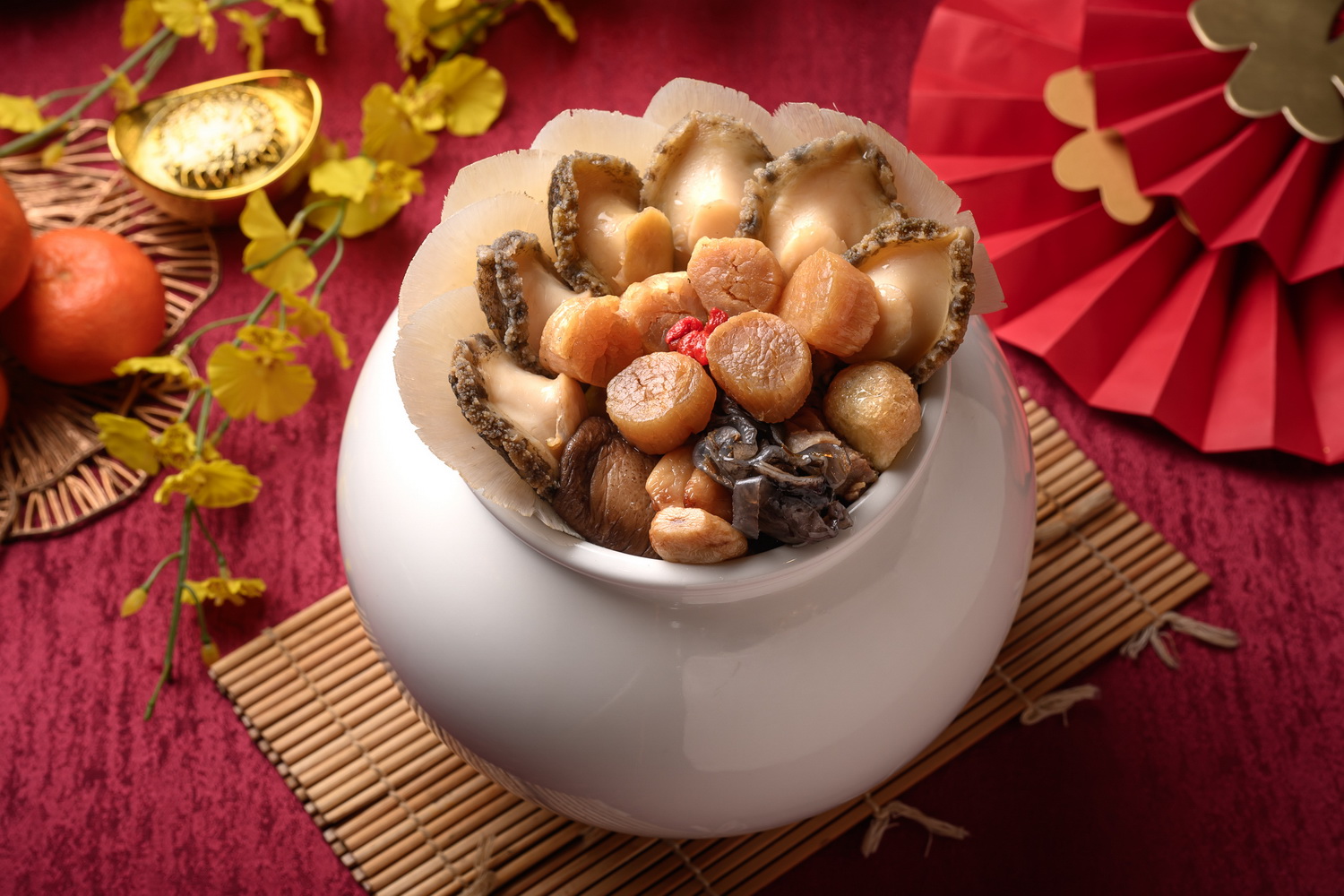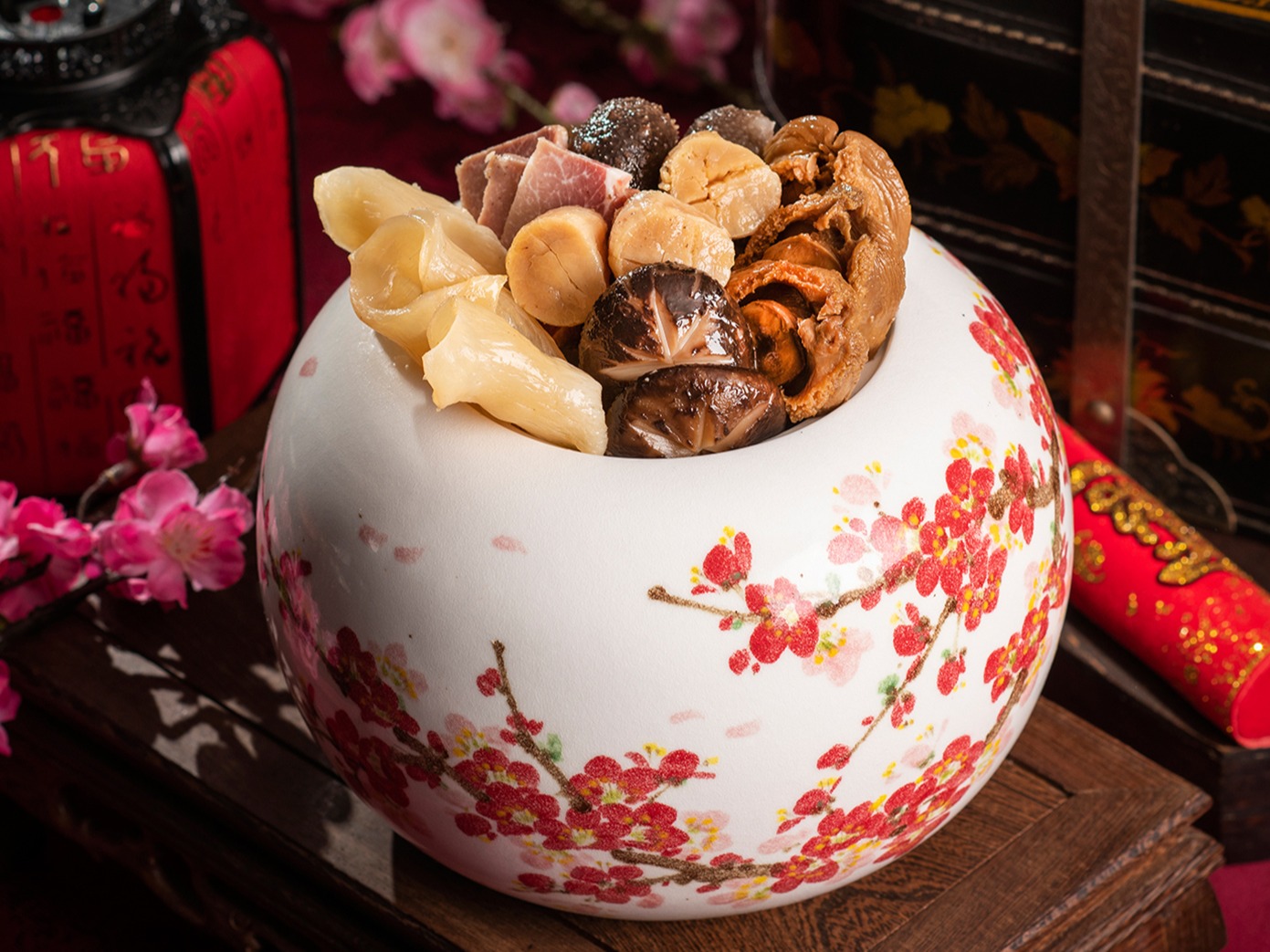 寒舍食譜系列以粵菜為骨幹。佛跳牆選用花膠、鮑魚與高等級乾貨,湯體厚實卻不顯負擔;布袋雞以全雞包覆內餡慢燉,適合提早準備、回溫後依舊完整。稻草西施牛則以煙燻香氣撐起肉料理存在感,是近年詢問度極高的主菜。宴會廳熱年菜則更接近飯店現場節奏,適合希望「除夕當天直接上桌、不再進行任何處理」的家庭。這樣的雙線設計,讓寒舍艾美在年菜市場中顯得特別成熟而實用。