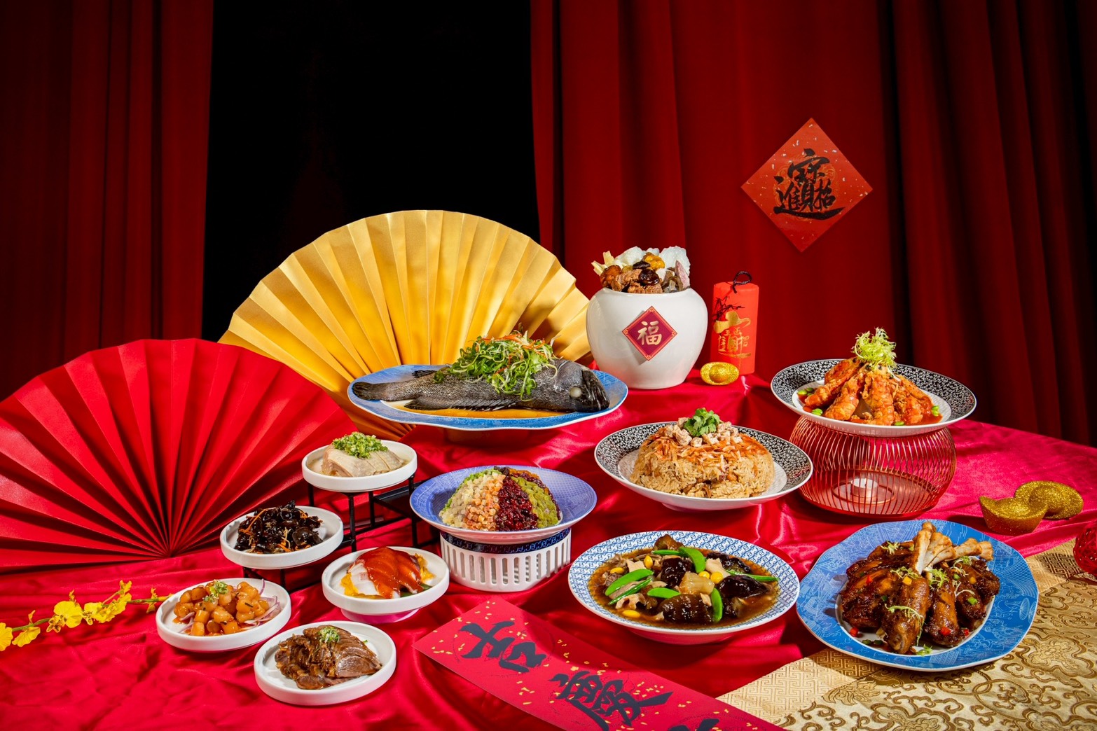 晶華的年菜更像一座可自由組裝的宴席資料庫。七大餐廳同步出手,讓圍爐餐桌可以依家庭結構自行編排。晶華軒的古法佛跳牆是核心主菜,乾貨比例拿捏得宜,湯體厚實卻不顯負擔;搭配粵式花膠與鮑魚料理,可組成完整的粵菜年宴。宴會廳的總鋪師白鯧圍爐宴,延續台式辦桌節奏,白鯧、龍蝦、芋泥依序上桌,長輩接受度高。三燔的鱈場蟹與龍蝦鍋物,則讓年夜飯轉為共享型餐桌;ROBIN’S 的肋眼或威靈頓牛排,提供完全不同的年菜結構。